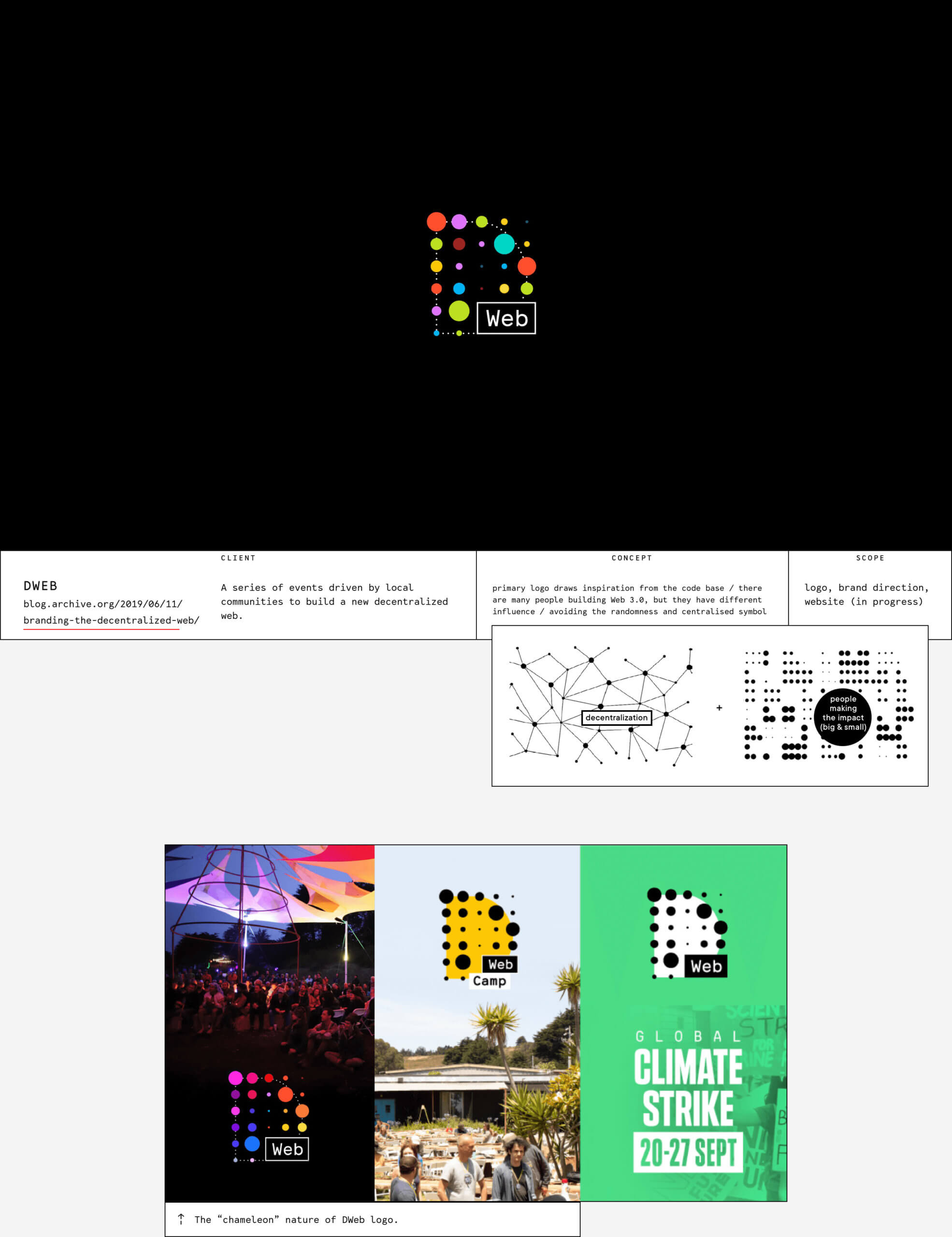 Yes. Since 2019, all my pro-bono time — which is approximately 100-150 hours per year — has been devoted to the DWeb community, where I serve as their Creative Director. (While I got paid for the DWeb Camp event identities every year.)